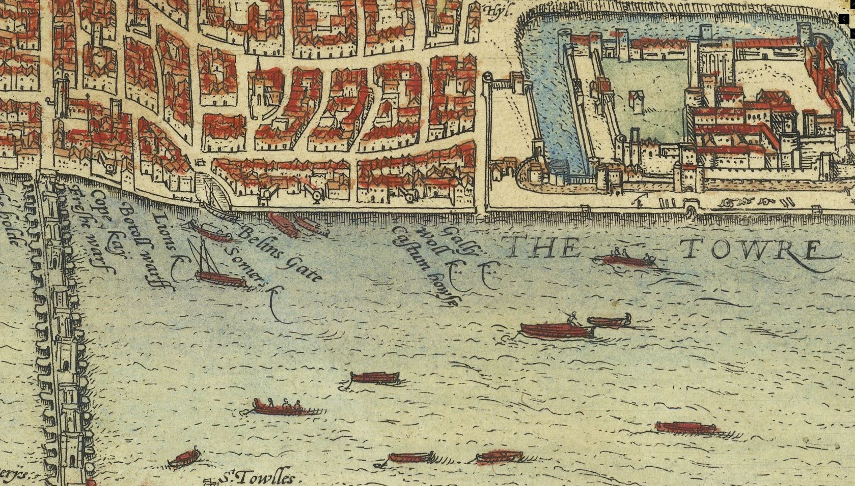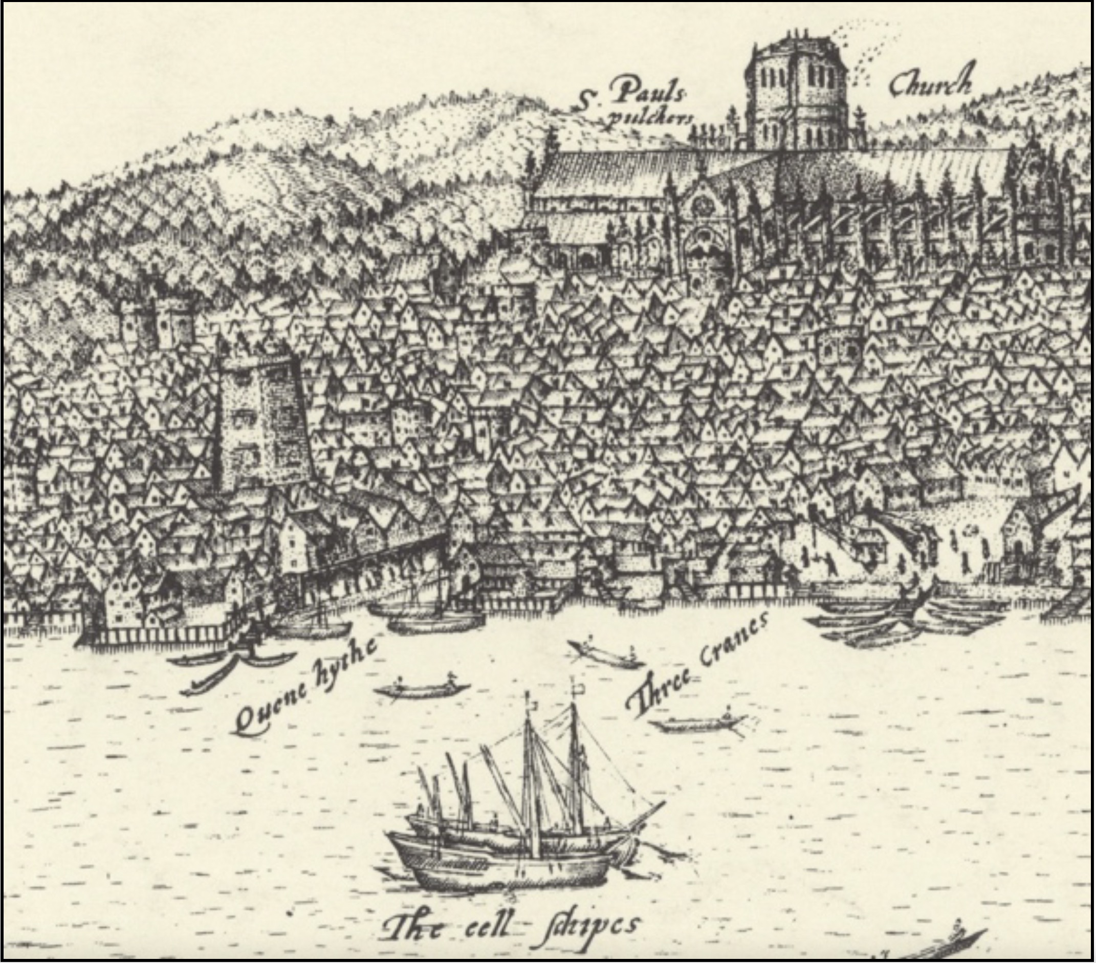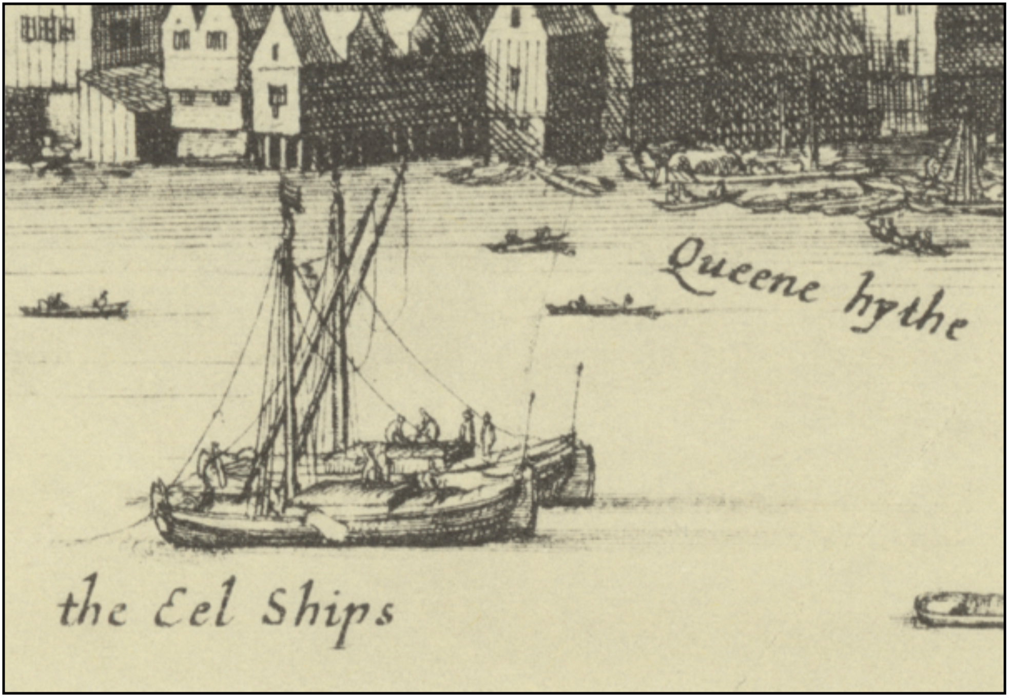 Hollandse cartograaf Claes Visscher maakte tussen 1616 en 1625 meerdere tekeningen en panorama’s van Londen waarop de “Eell Schipes” met label worden afgebeeld voor Queenhithe.