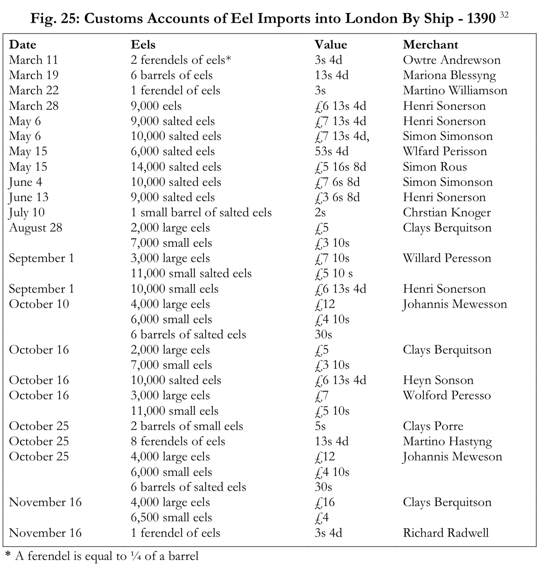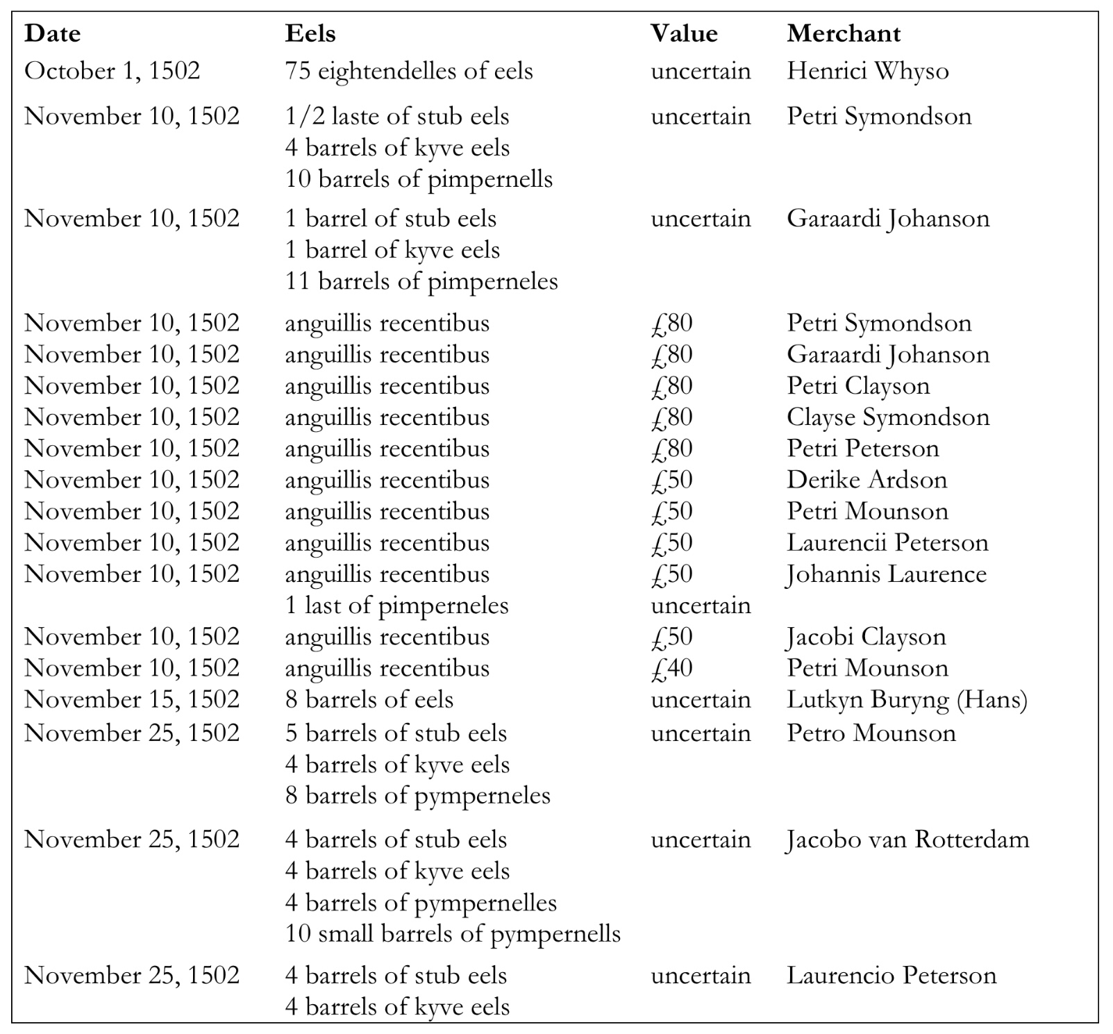 In de tabel de registratie van de handel in paling in oktober en november 1502. “Anguillis recentibus” zijn verse levende palingen. Gezouten paling wordt in vaten, “barrels”, verhandeld. De meeste handel vindt plaats in najaar en de winter als de schiere aal beschikbaar is. In de rest van het jaar wordt wel gezouten paling verhandeld.