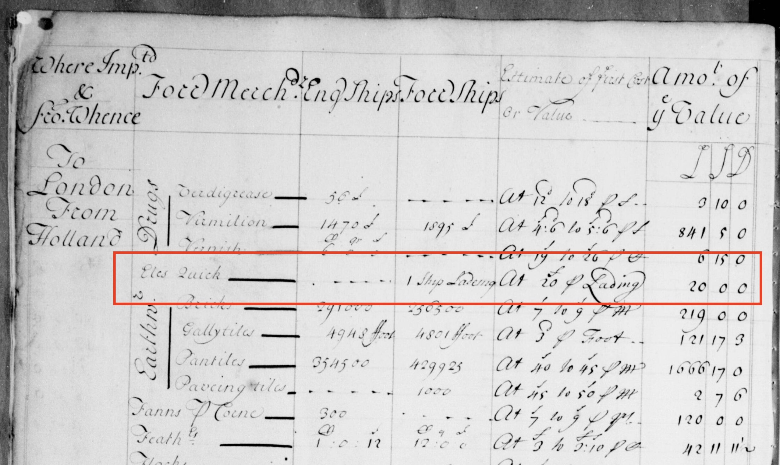 In de winter van 1559-1560 wordt in totaal voor een waarde van £ 1.580 (Pond), 13s. (Shilling) en 4d. (Pence) aan handel in “Eles Fresh and Salt” genoteerd in de London port book. In deze jaren is de registratie per jaar flink verschillend maar er missen ook veel havenboeken of ze zijn beschadigd. Voor £ 1.000 kon je in die tijd een flink landhuis kopen…