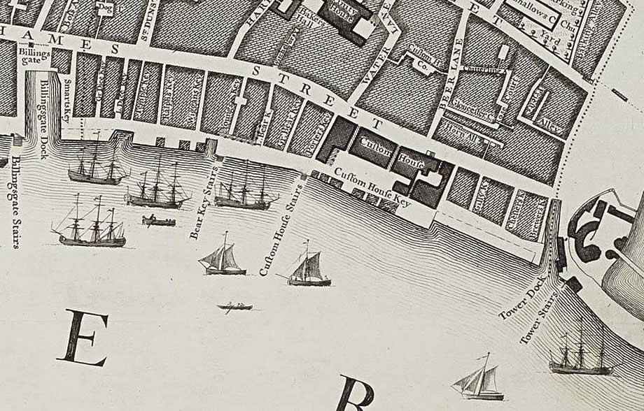 Het plaatje komt van een kaart van Hollar uit 1647 en toont “the Eel Ships” met zijzwaarden in detail voor Queenhithe.