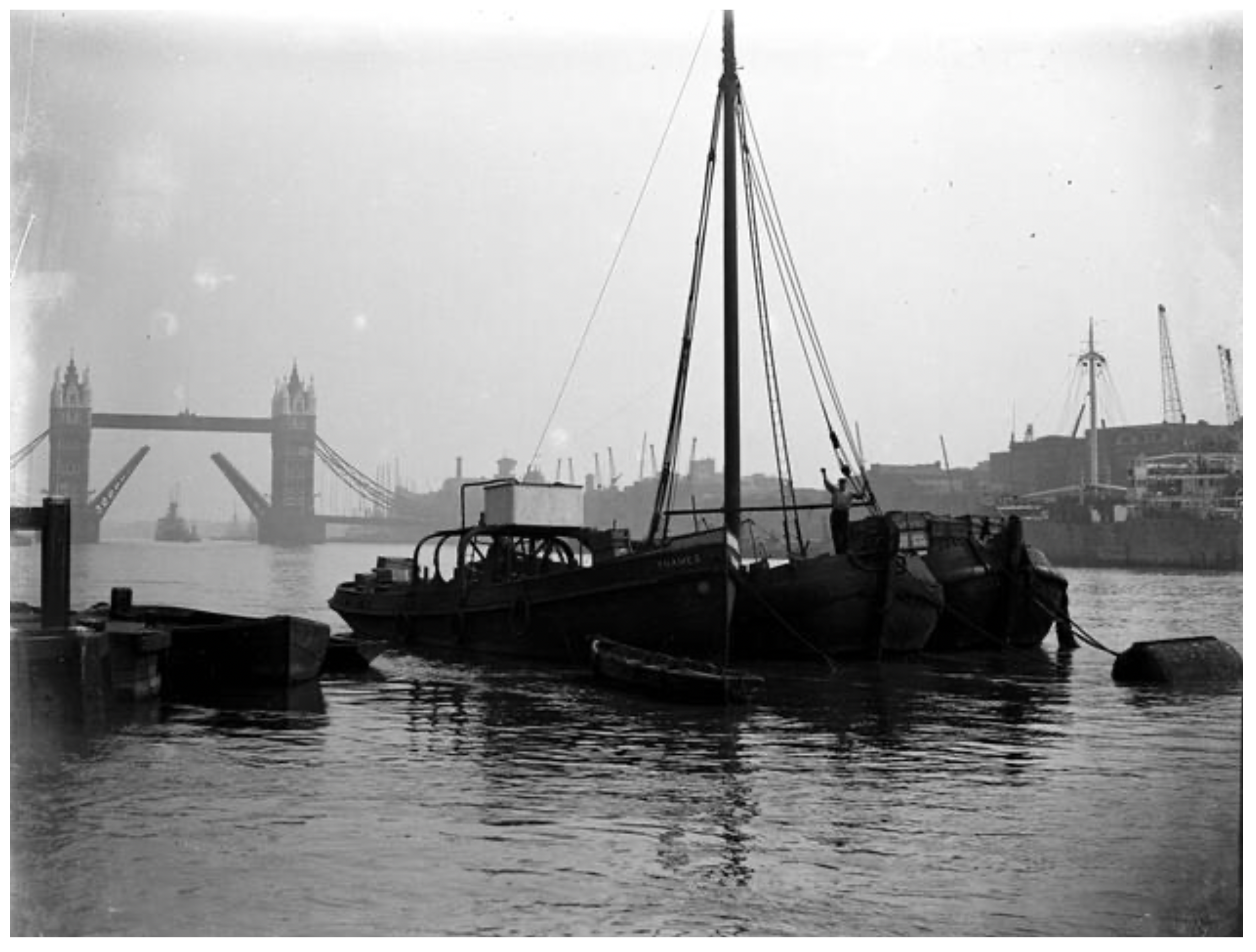 Op de foto ligt het motorschip de Thames uit Heeg langszij. Daarmee werd de paling vanaf Holehaven Creek naar de aken gebracht. Op het voordek is een grote stapel kisten te zien, de paling ging al vaak de bun niet meer in i.v.m. de slechte waterkwaliteit.